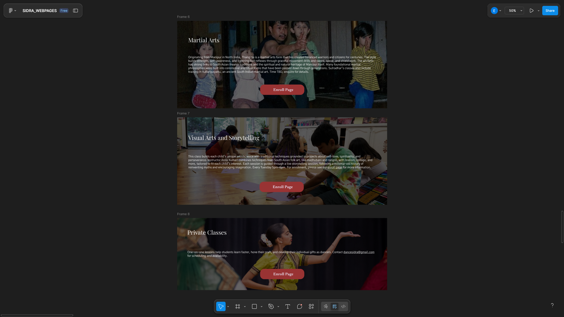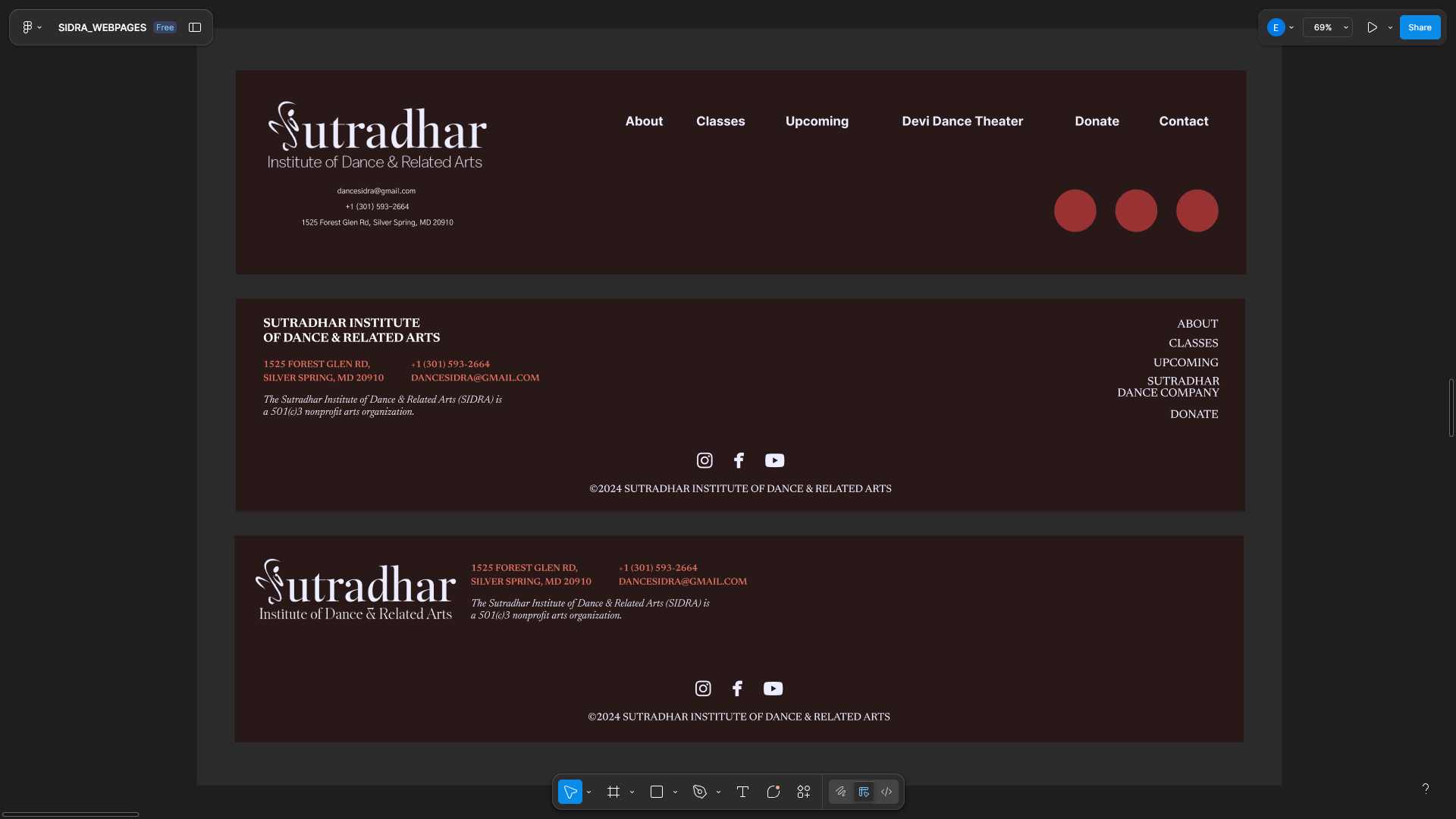 Sutradhar Institute of Dance and Related Arts (SIDRA) is a local non-profit dance organization in Silver Spring, Maryland. Even though the main focus of classes are Kuchipudi, a traditional Indian dance style, they offer other disciplines and services that can be a fit for anyone who is insterested in art and spirituality. Being active since the 1980's, they are an established organization that stays active in their community. Their program manager reached out to me about updating their logo and website, and I managed to finish their brand guideline and a press kit, and with a team, we were able to create a new website for the company.